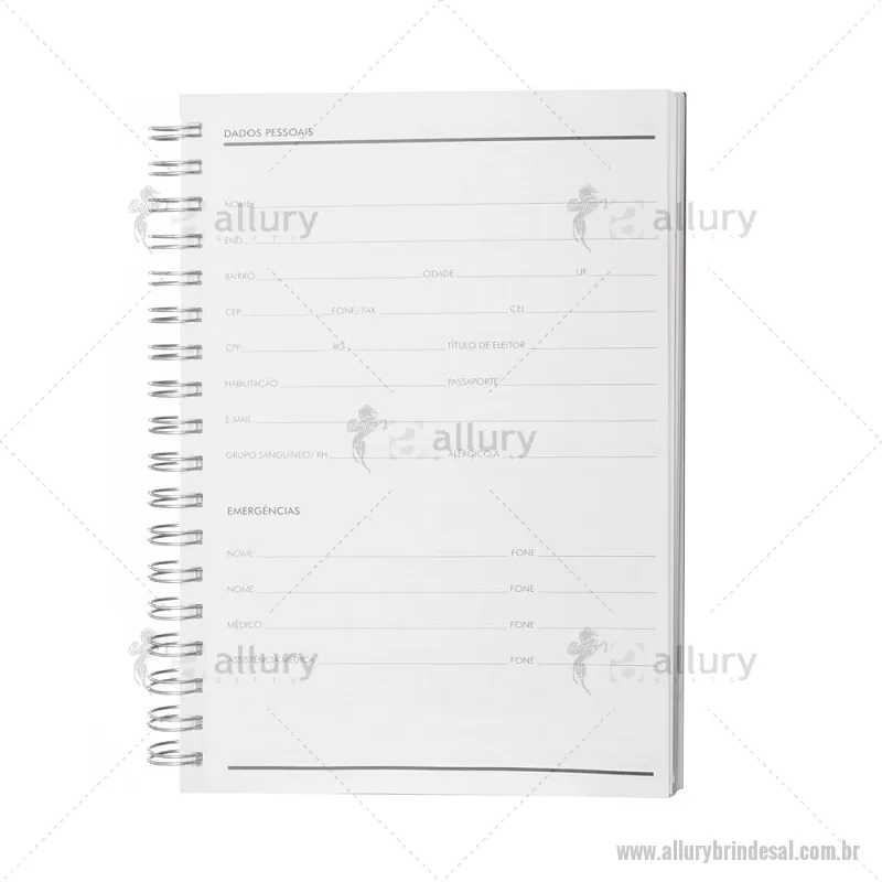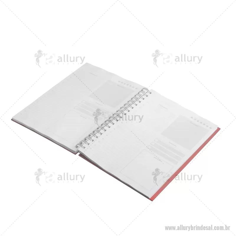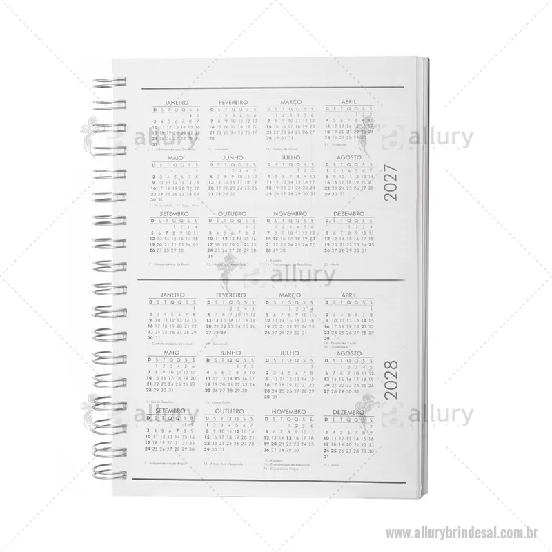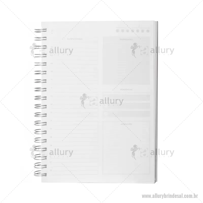 Caderno planner em espiral com capa rígida em Percalux de 2 mm. Possui 90 folhas brancas de 95 g/m² com layout de planner, ideais para organização e controle da rotina. Inclui páginas de dados pessoais, calendários de 2025 a 2028 e espaços para anotações mensais. - - ALLALCAD034