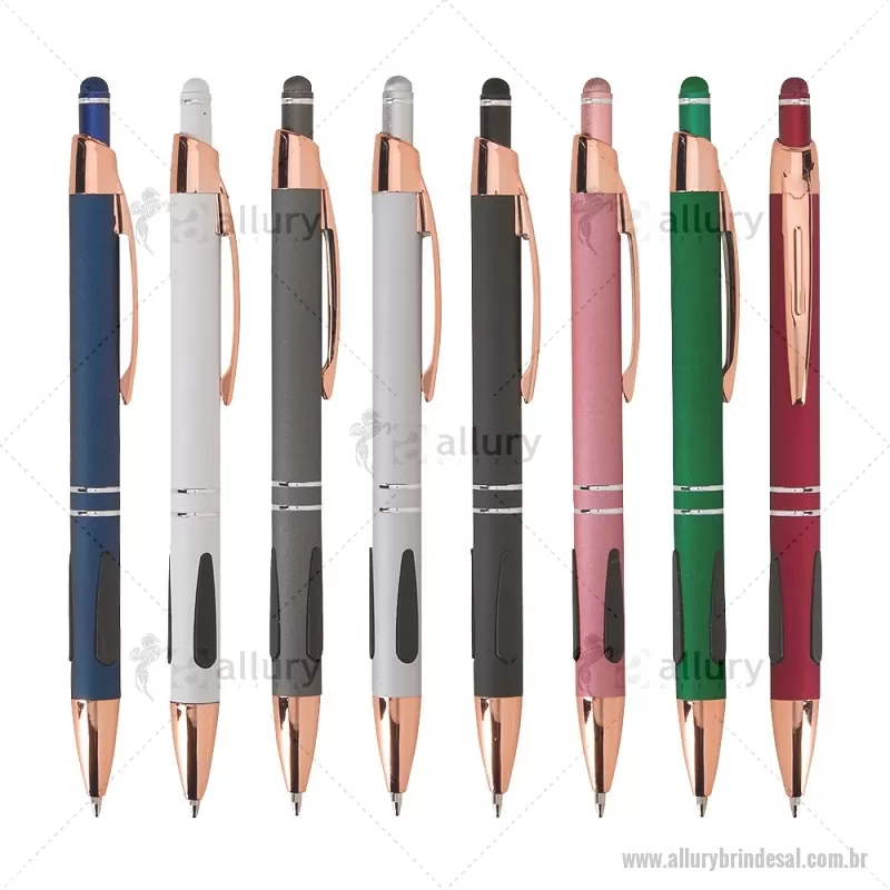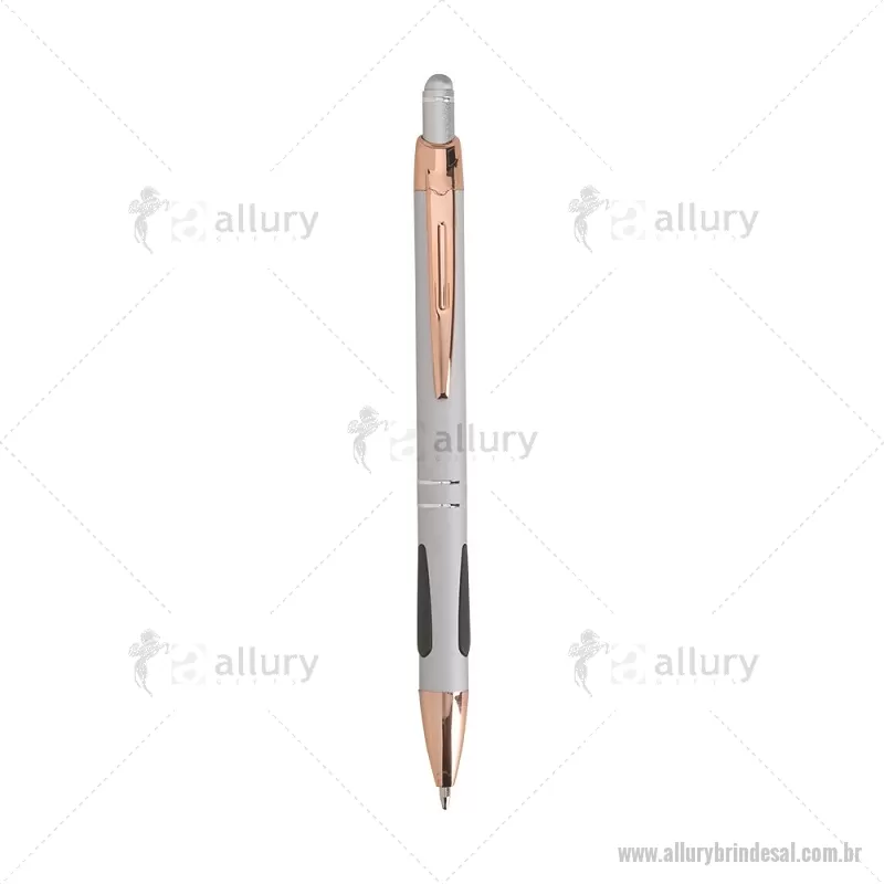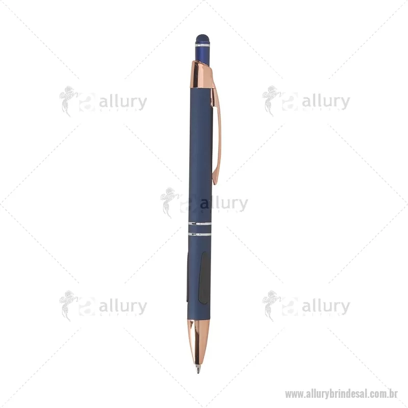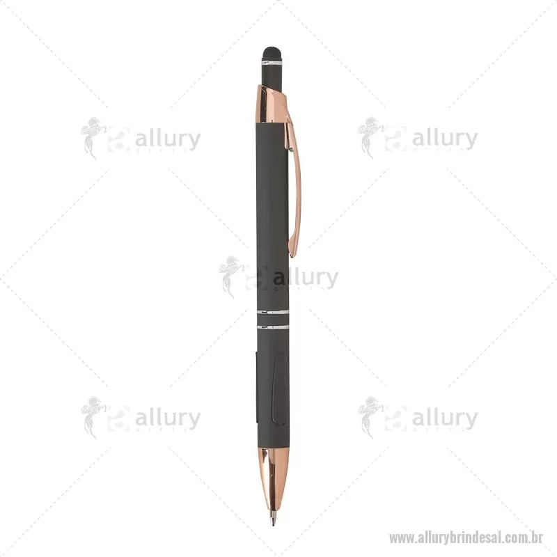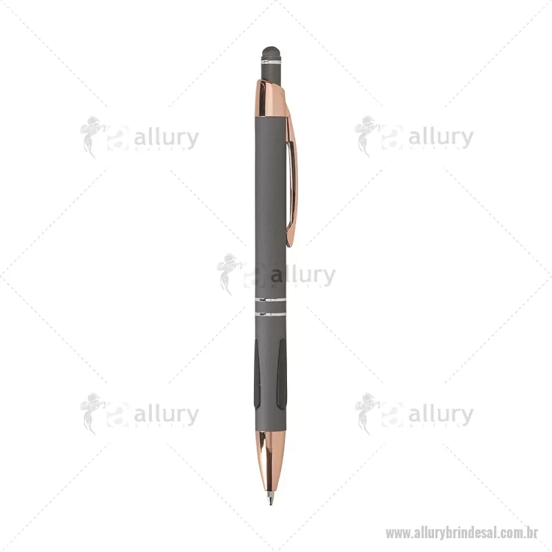 Caneta em metal com detalhes emborrachados, carga esferográfica azul 1,0 mm e acionamento por clique. Possui ponta touch emborrachada para uso em telas sensíveis ao toque, unindo escrita e praticidade em um só item. - - ALLALCMT295