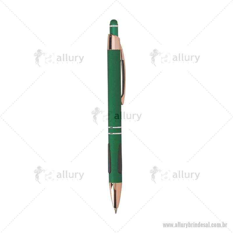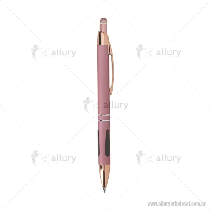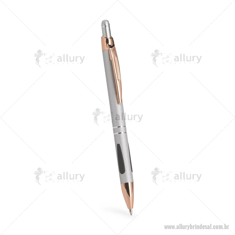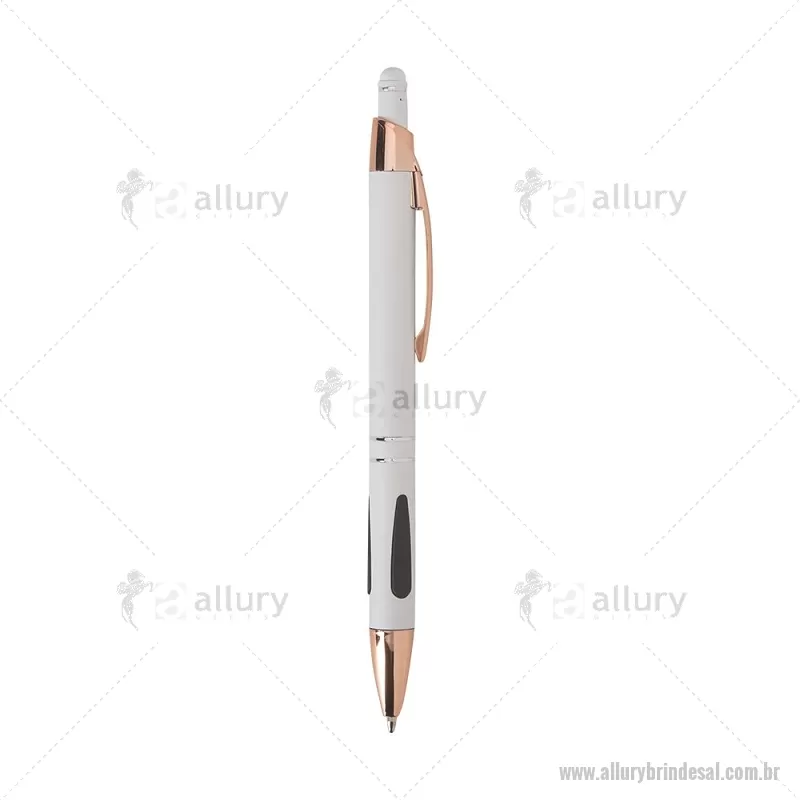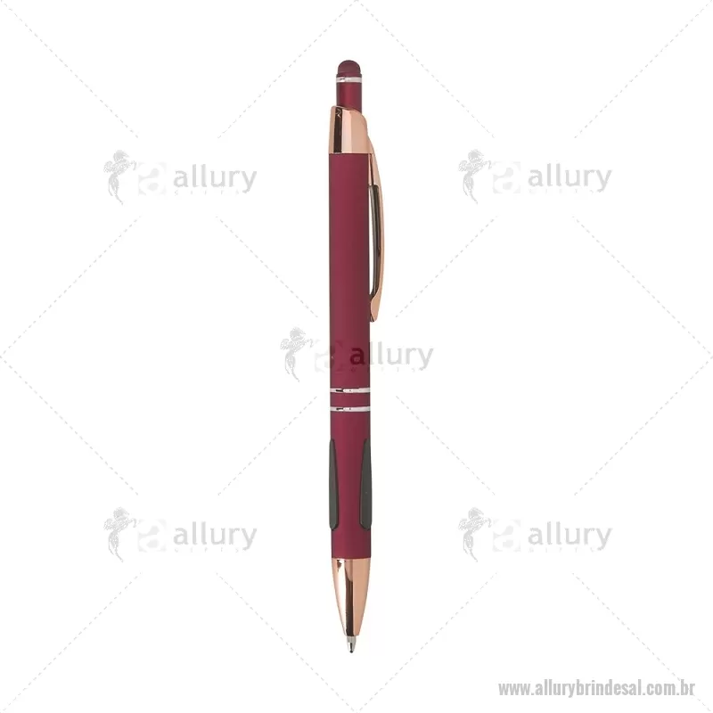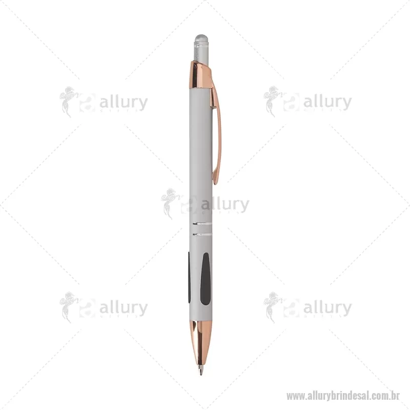 Caneta em metal com detalhes emborrachados, carga esferográfica azul 1,0 mm e acionamento por clique. Possui ponta touch emborrachada para uso em telas sensíveis ao toque, unindo escrita e praticidade em um só item. - - ALLALCMT295