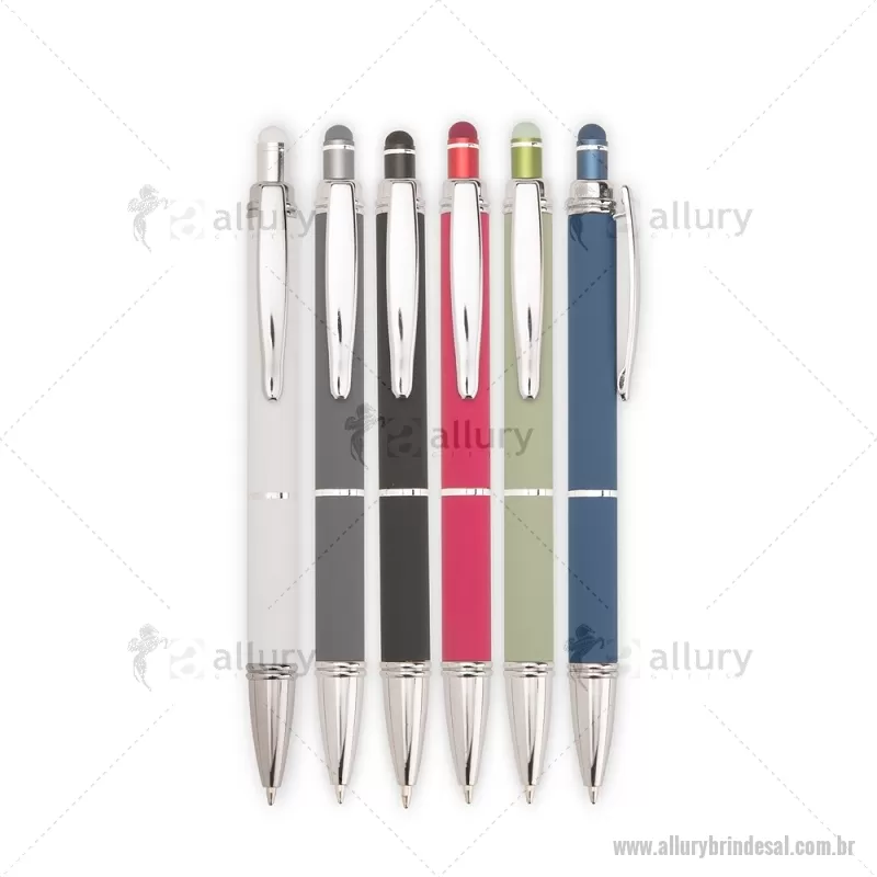 Caneta metálica com pintura de acabamento emborrachado. Possui acionamento por clique, topo emborrachado para uso em dispositivos com telas sensíveis ao toque e carga esferográfica azul de 1,0 mm. Altura : 14 cm x Largura : 1,6 cm Peso aproximado (g): 18 - - ALLALCMT316