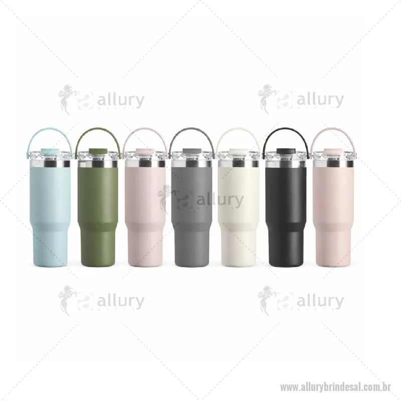 Copo térmico em aço inox com capacidade de 900ml, construído com parede dupla e isolamento a vácuo para melhor conservação térmica. Possui tampa plástica rosqueável com vedação, tampa protetora de bocal, bico flip e canudo interno removível. Inclui alça para transporte e acabamento em pintura eletrostática de alta resistência. - - ALLALCPO154