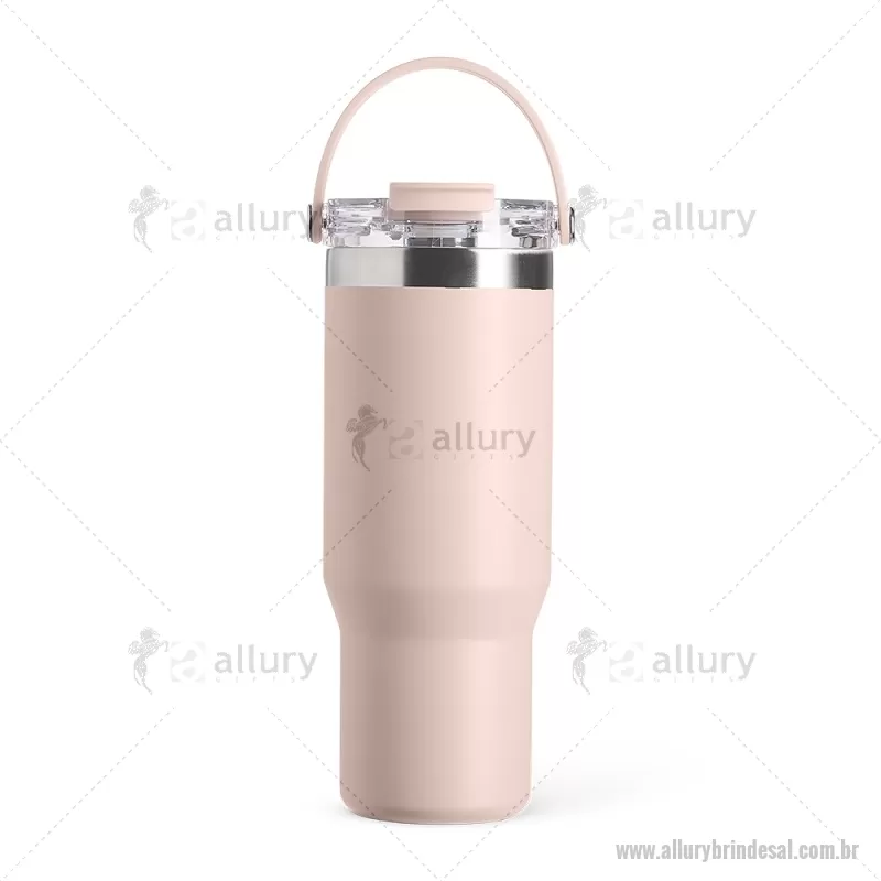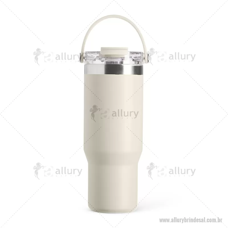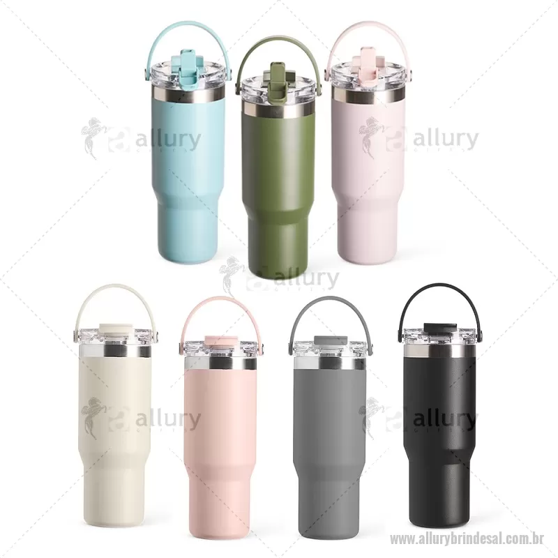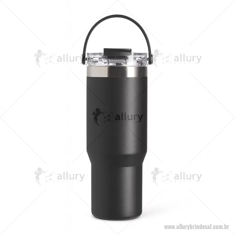 Copo térmico de 900 ml em aço inox com parede dupla, ideal para manter a temperatura de bebidas por mais tempo. Possui tampa plástica rosqueável com vedação a vácuo, proteção para o bocal, bico flip com canudo interno removível e alça para transporte. Conta com acabamento em pintura eletrostática, garantindo durabilidade e visual sofisticado. - - ALLALCPO146
