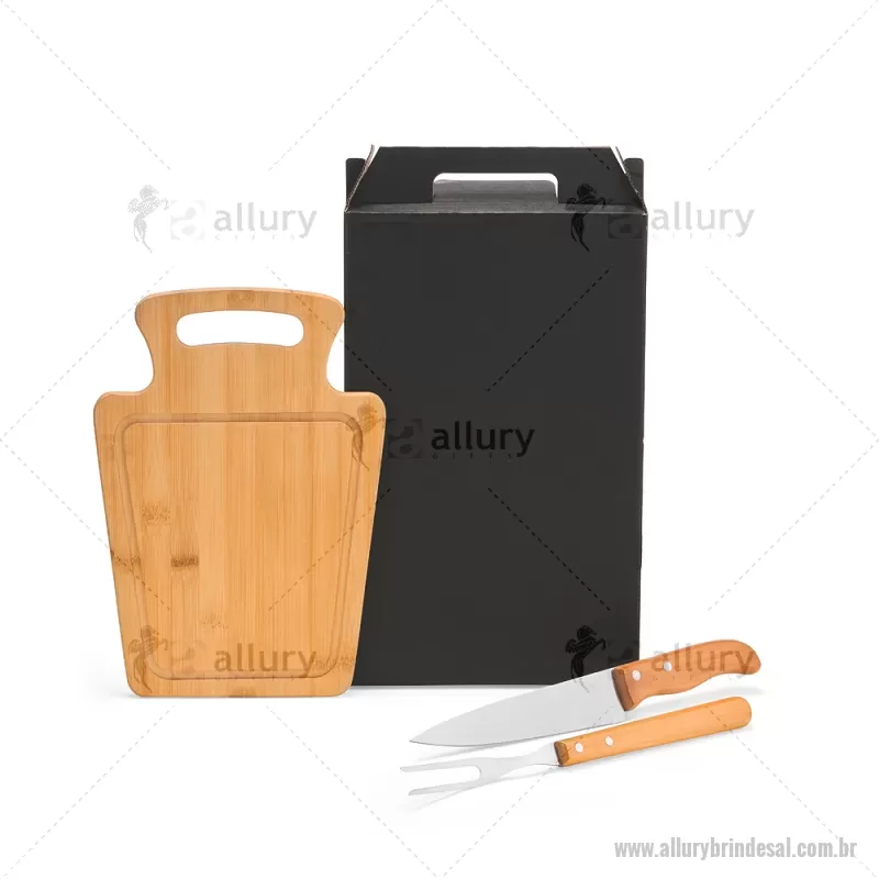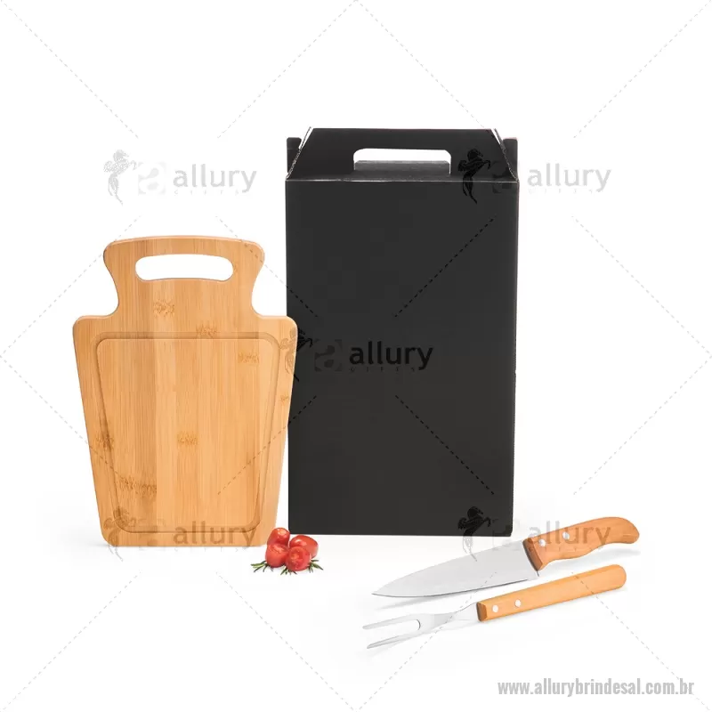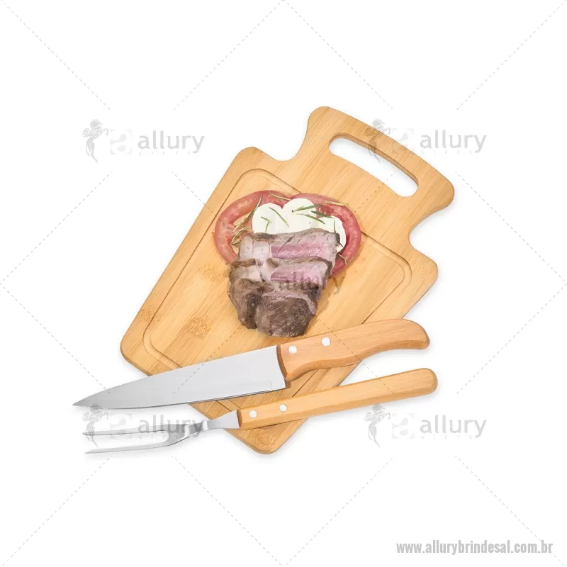 Conjunto Para Churrasco Em Bambu / Madeira / Inox - 3 Pçs Composto por tábua em Bambu com 30x21x1,2 cm; faca 7'' e garfo em Madeira/Inox. Dimensões do Produto Tábua: 30x21x1,3 cm Sugestão de Personalização Uma gravação a Laser na petisqueira e lâmina da faca; uma gravação em Silk/Digital na caixa. Embalagem : Caixa Preta 40x21,8x4,5 cm (AxLxP) Peso: 619 g (com embalagem) - - ALLALKCH095