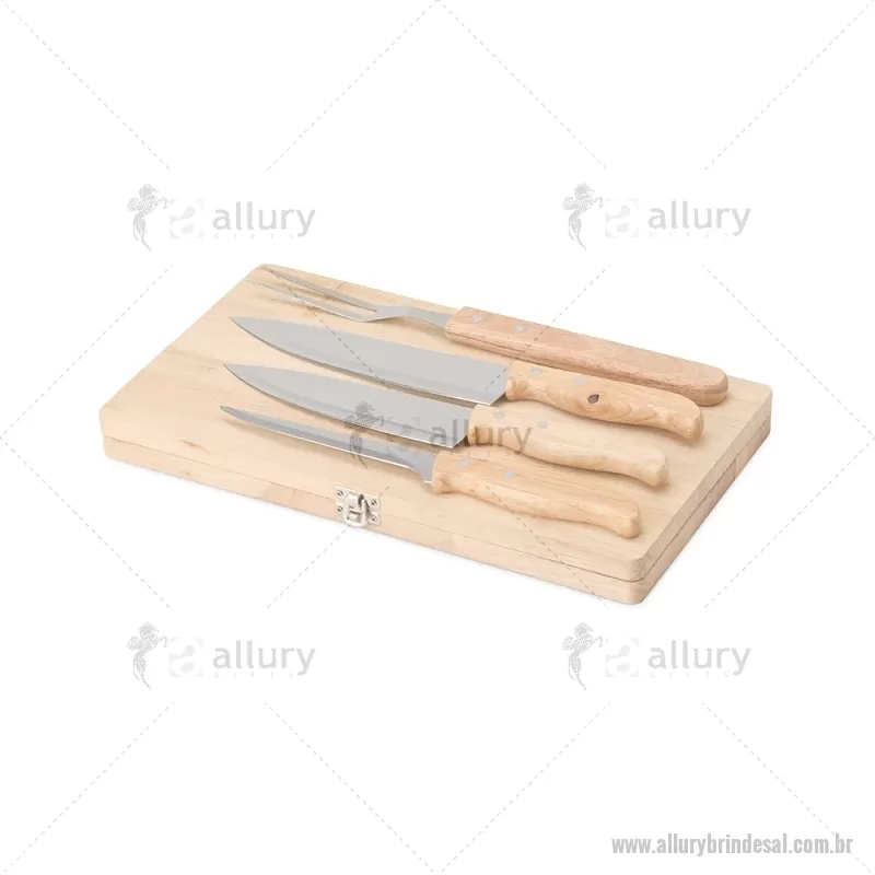 Kit Churrasco com 4 Peças e Estojo de madeira. Brinde ideal para quem curte passar o fim de semana cercado da família e amigos. Kit churrasco 4 peças em estojo de madeira. Contém três facas e um garfo. Altura : 3 cm x Largura : 35,4 cm x Profundidade : 19,8 cm Peso aproximado (g): 1449 - - ALLALKCH040