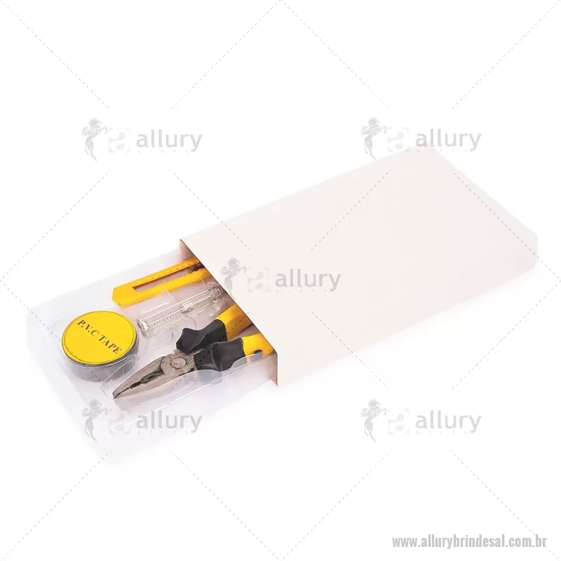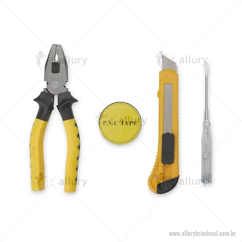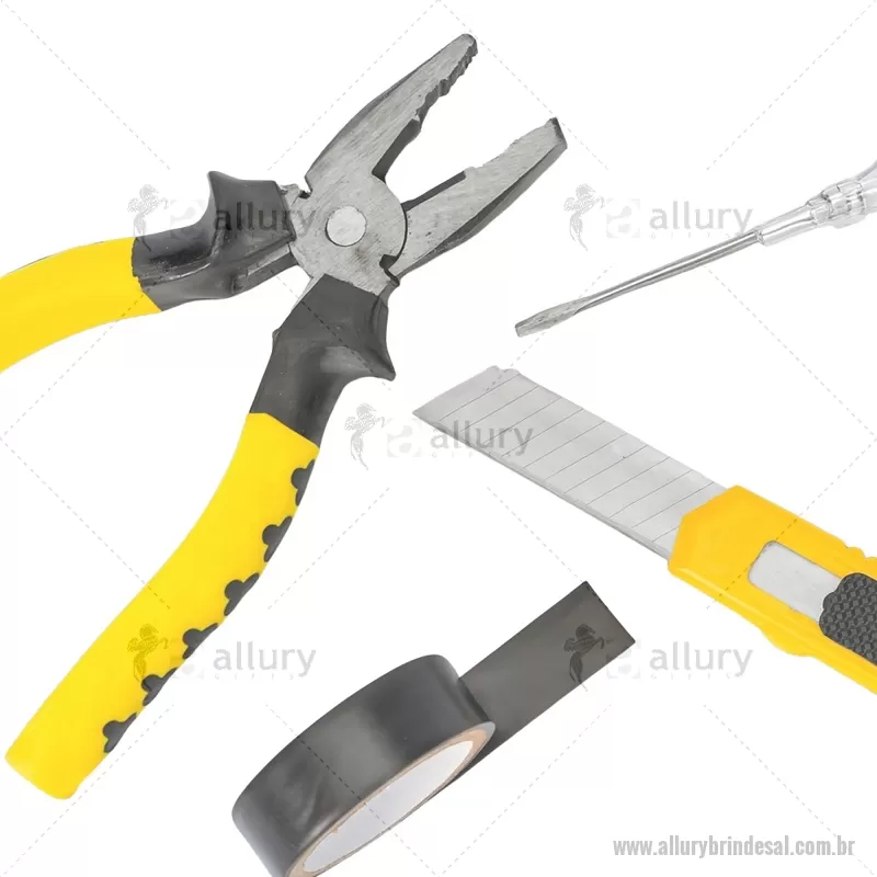 Kit de ferramentas compacto para uso diário, composto por chave de fenda teste, estilete, alicate e fita PVC. Todas as peças possuem acabamento em plástico resistente, oferecendo praticidade, conforto e durabilidade para pequenos reparos e imprevistos do dia a dia. - - ALLALFER066