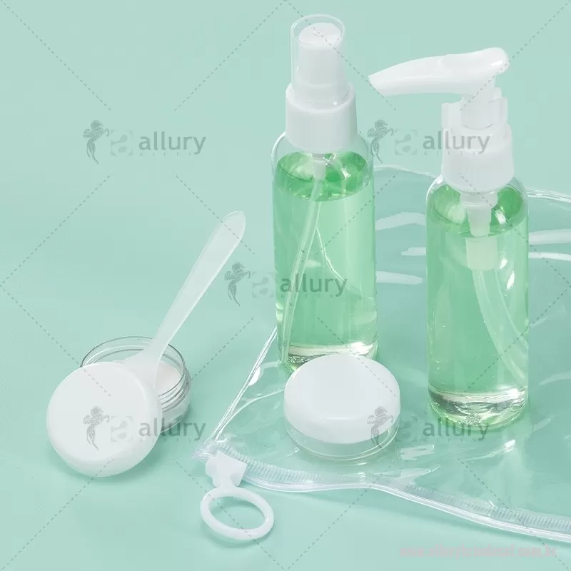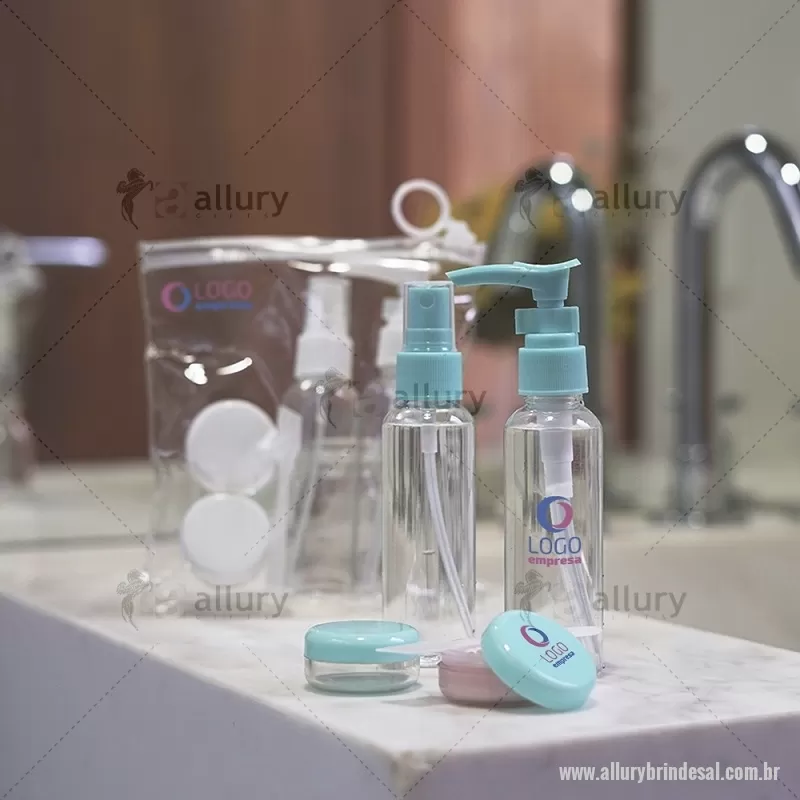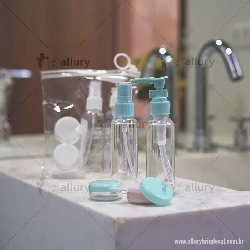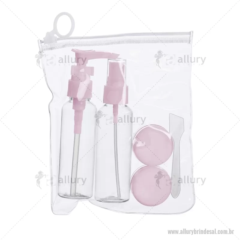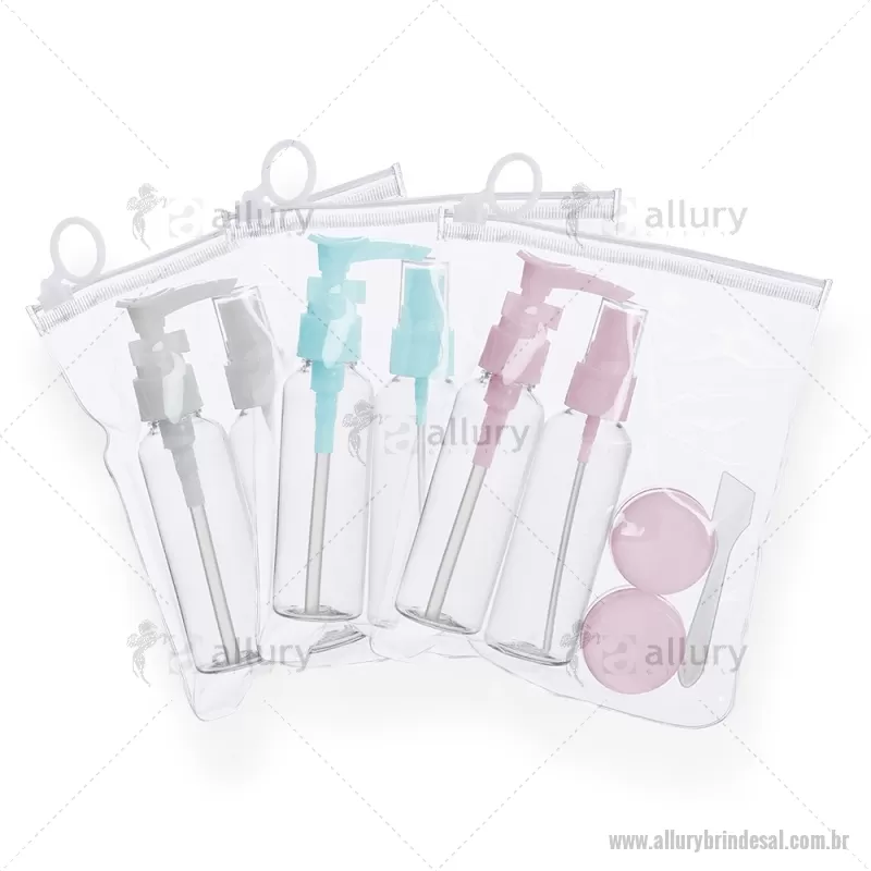 Kit Viagem 5 Peças Descrição: Kit viagem 5 peças em estojo ziplock. Contém frasco de 70ml com tampa spray; frasco de 70 ml com tampa pump; 2 potes de 10ml com tampa rosqueável e mini espátula fosca. Frascos plásticos e estojo em pvc com puxador plástico. Altura : 17,2 cm x Largura : 14,5 cm Peso aproximado (g): 61 - - ALLALKVG017