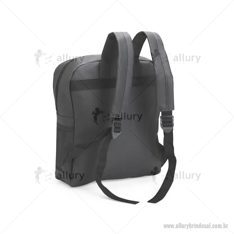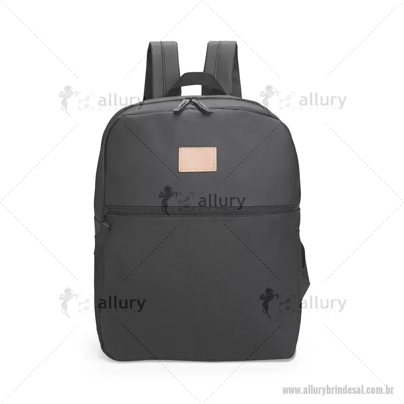Mochila em couro sintético impermeável, com fechamento em zíper e capacidade de até 20 litros. Possui compartimento interno com divisória para notebook de até 14”, além de bolso frontal com plaquinha decorativa e dois bolsos laterais em tela de nylon. Prática e ideal para o uso diário. - - ALLALMC249