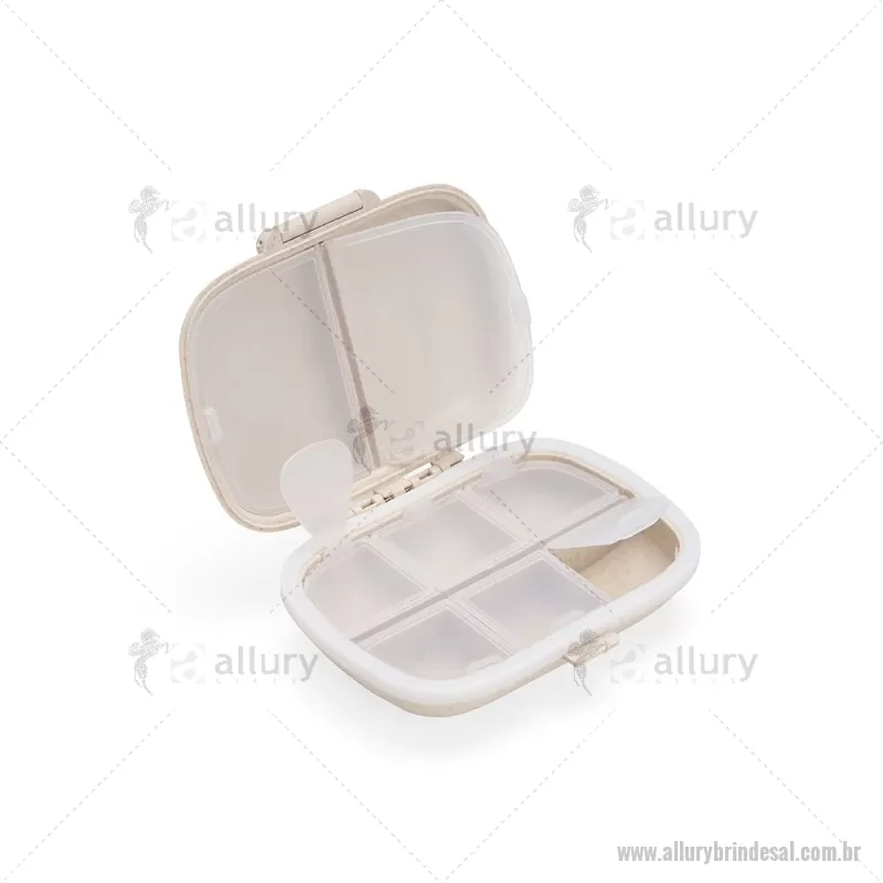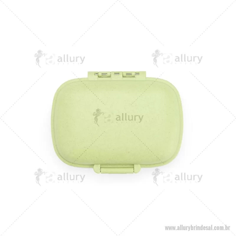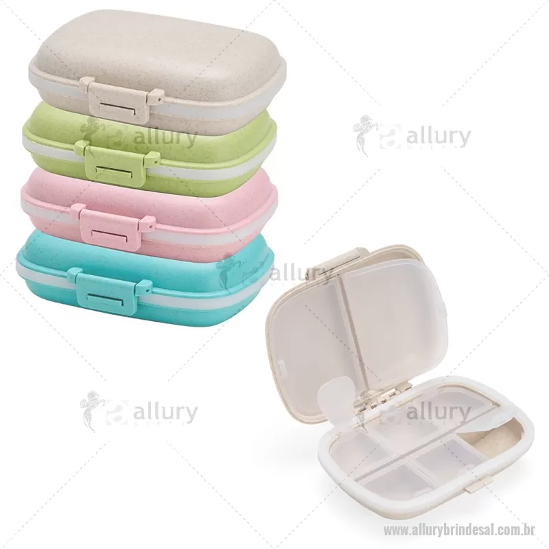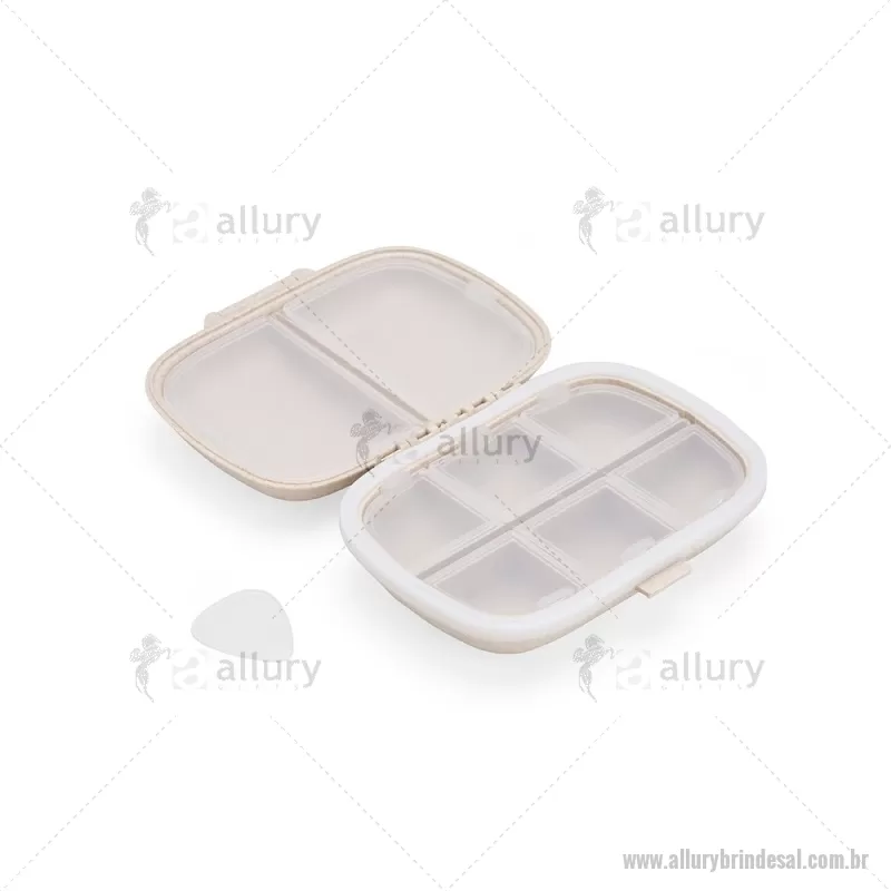 Porta-Comprimidos Plástico Porta-comprimidos compacto feito em plástico obtido da palha de trigo e anel de vedação para as bordas em silicone. Possui oito compartimentos com tampas removíveis, sendo dois maiores com capacidade de até 30ml e seis menores com até 10ml cada. Acompanha palheta multiuso. Largura : 8,6 cm x Espessura : 3,6 cm x Comprimento : 11 cm Peso aproximado (g): 72 - - ALLALPCP016