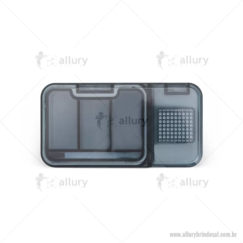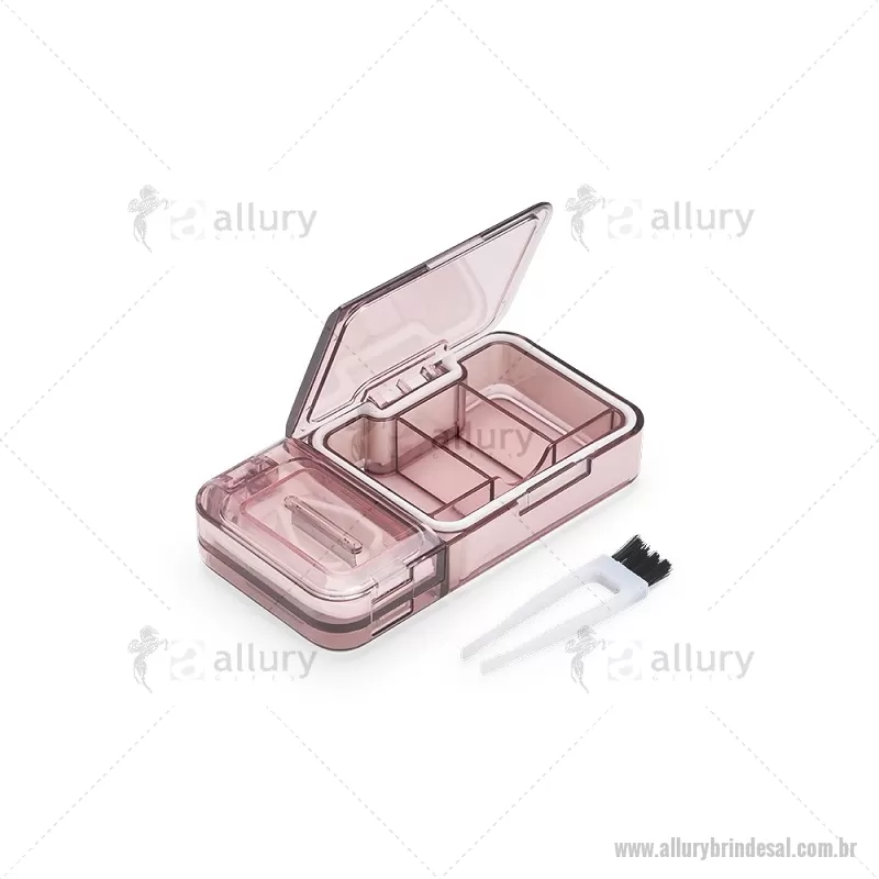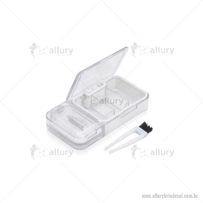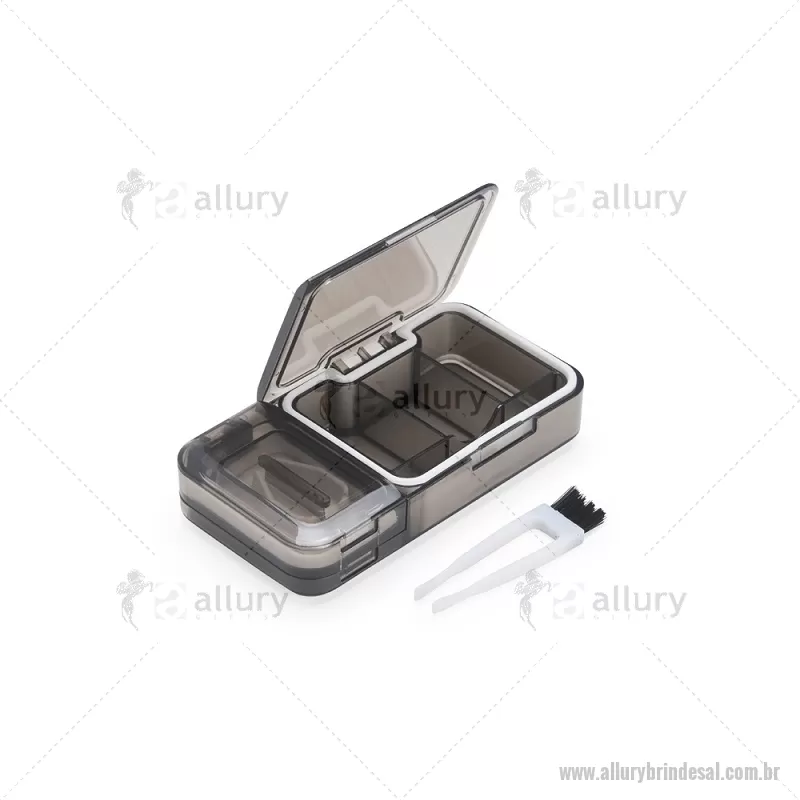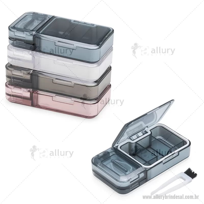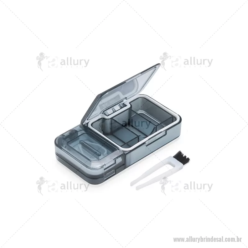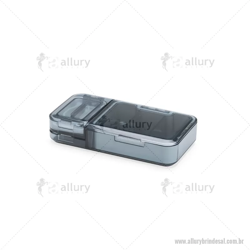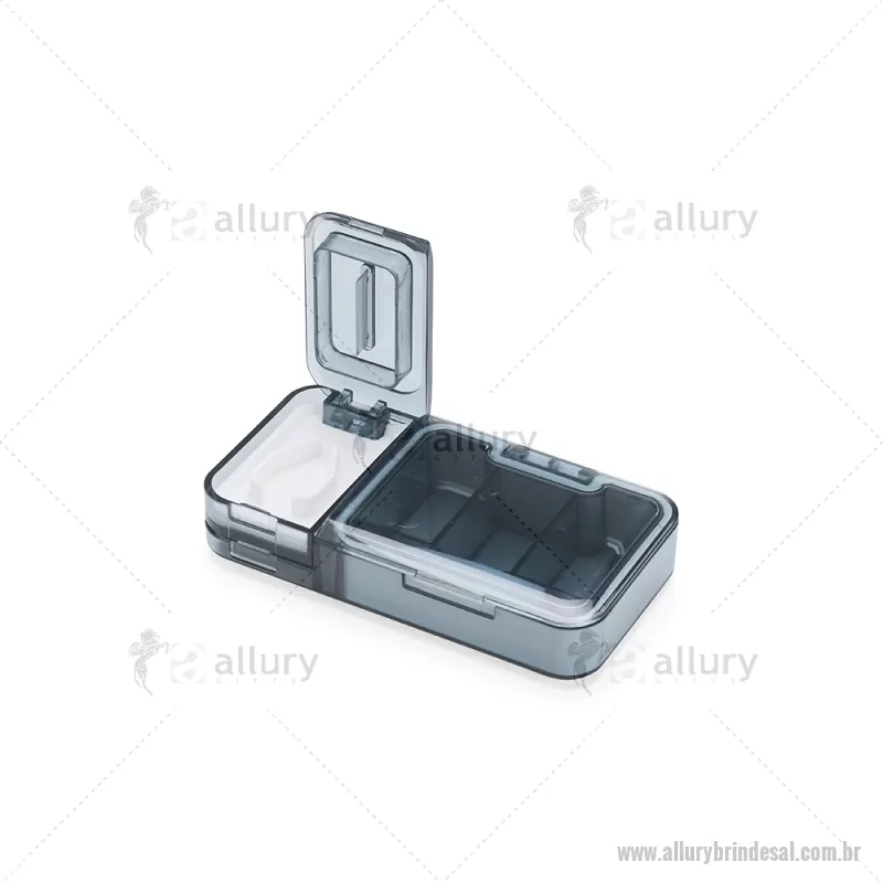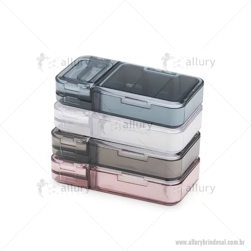 Porta Comprimidos Plástico Descrição: Porta-comprimidos multifuncional em plástico. Possui três divisórias com capacidade de até 10ml cada, além de dois compartimentos especiais: um cortador de comprimidos na parte superior e outro para trituração, localizado na parte inferior. Largura : 6 cm x Espessura : 2,5 cm x Comprimento : 12 cm Peso aproximado (g): 107 - - ALLALPCP017