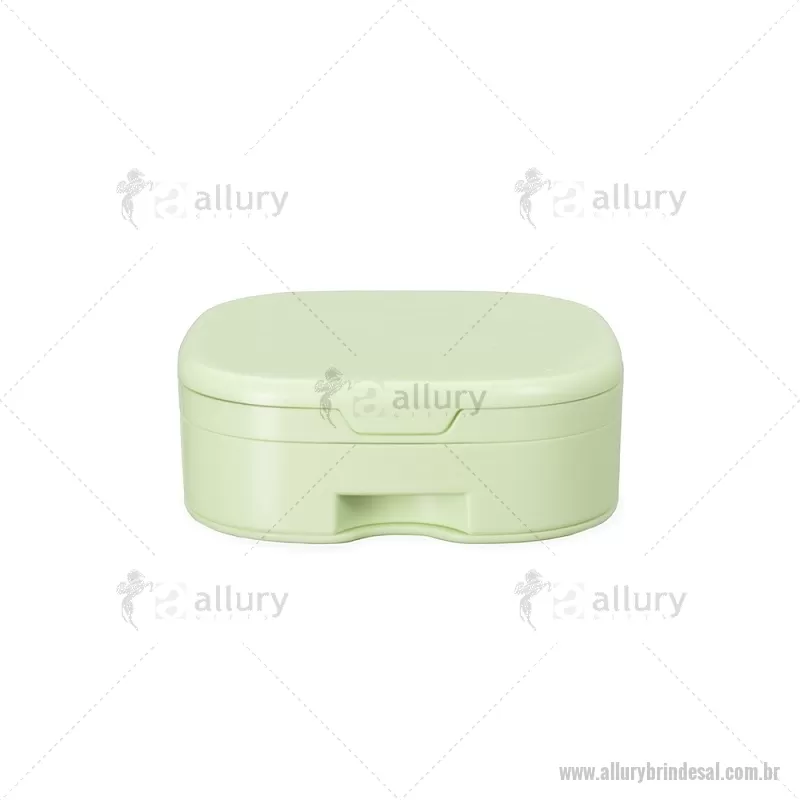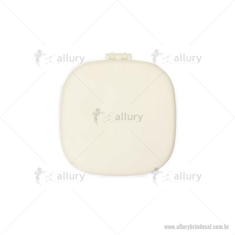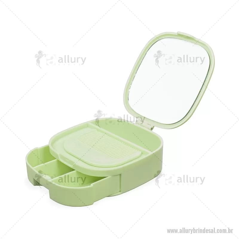 Porta-joias feito em plástico com espelho sem aumento na parte interna da tampa. Possui compartimentos internos de tamanhos variados e uma gaveta com três divisórias. Acompanha um pente compacto para cabelos. Altura : 3,5 cm x Largura : 9,9 cm x Comprimento : 9,9 cm Peso aproximado (g): 133 - - ALLALFEM120