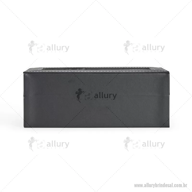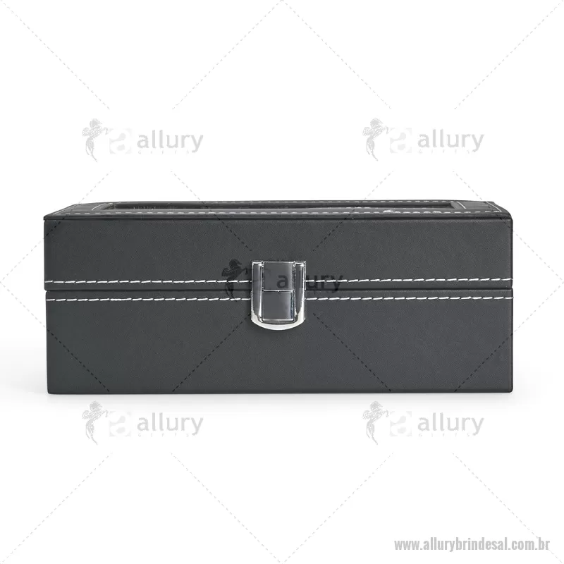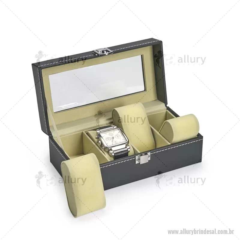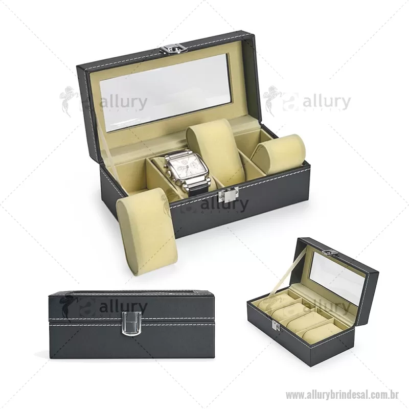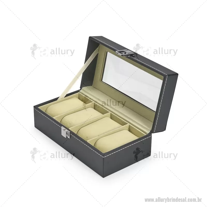Porta-relógios com acabamento em couro sintético em PVC e interior forrado em veludo. Possui quatro compartimentos com almofadas de espuma removíveis, visor superior em vidro e trava de segurança, ideal para organizar e proteger relógios com elegância. - - ALLALPREL003